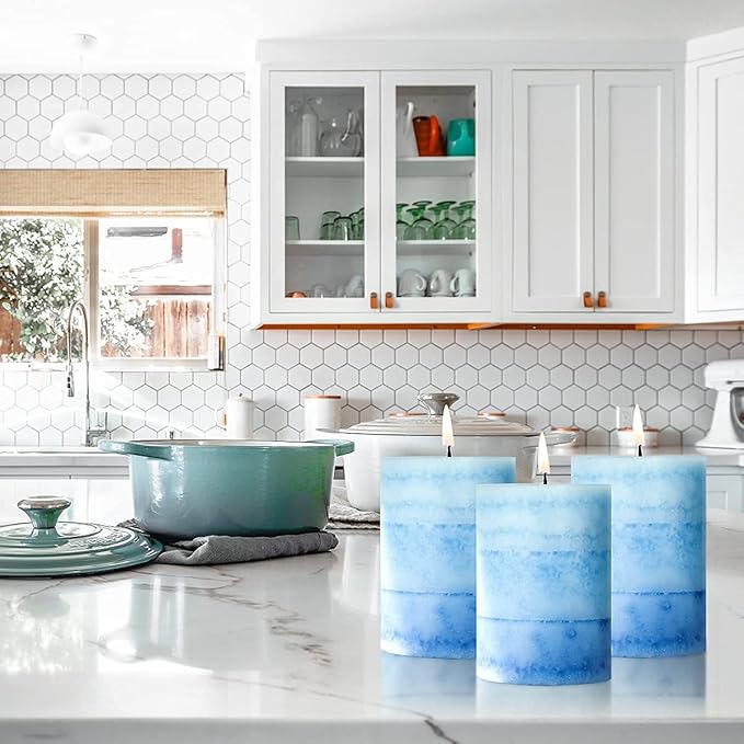 [安全性と環境に優しい] この装飾的な青いピラーキャンドルは、植物&エッセンシャルオイルと鉛フリーの芯を含む100%天然パラフィンでできており、散らからず、燃えても滴り落ちません。