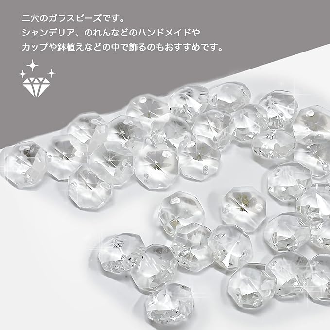 シャンデリアの補修用としても使えるこのビーズは、光を効果的に反射し、美しい輝きを演出します。ガラス特有の透明感が、インテリアのアクセントになり、どんな空間にもマッチします。鉢植えの装飾や、カップに入れてテーブルデコレーションに使用することで、手軽に華やかな雰囲気を作り出せます。ガラスビーズを活用することで、室内の光をより引き立て、洗練されたインテリア空間を演出できます。