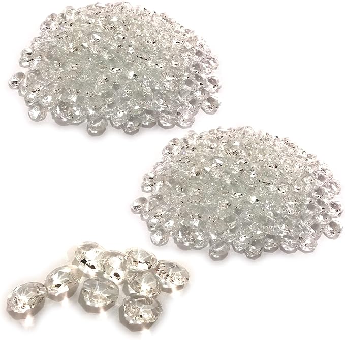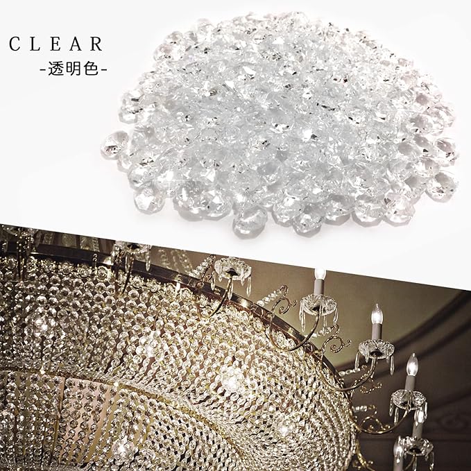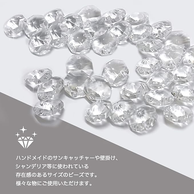 この14mm八角形のクリスタルガラス製ビーズは、透明感のあるクリアタイプと、虹色の輝きを放つレインボータイプの2種類をご用意しています。シャンデリアのパーツとしてはもちろん、ハンドメイドのサンキャッチャーや壁掛け、のれん作りなど、多様な用途にお使いいただけます。ガラス製のため、樹脂製ビーズに比べて変色しにくく、長期間にわたり美しい輝きを保つのが特長です。お部屋の装飾やDIYプロジェクトにもぴったりのクリスタルビーズです。