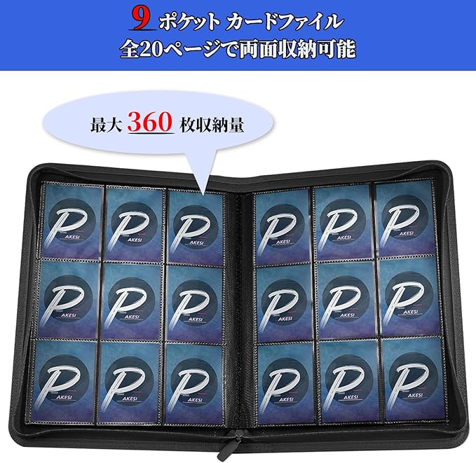 「360枚大容量収納」合計20ページがあり、360枚のカードを収納できます。各ページ両面収納可能、横入れ、9ポケットの仕様です。お気に入りのカードを簡単に取り出せ、その瞬間を楽しむことができます。