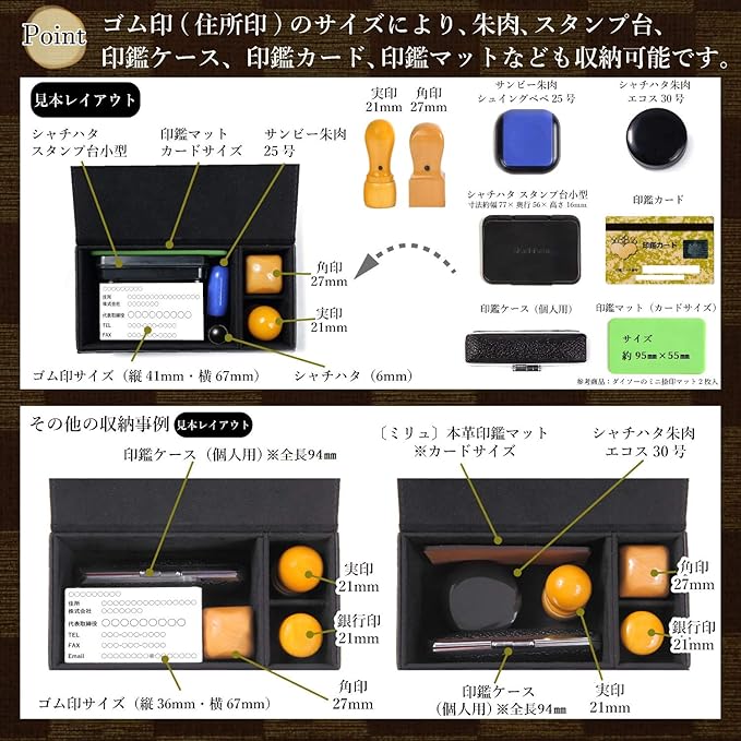 ✅銀行・契約・商談などの外出先にも持ち運び出来る大きさなので、とても利便性の高い法人用印鑑ケースとなっております。 ・コンパクトなサイズ感ですが、小さい朱肉・スタンプ台・印鑑マットから印鑑カード、個人印鑑などもレイアウト次第では収納できます。