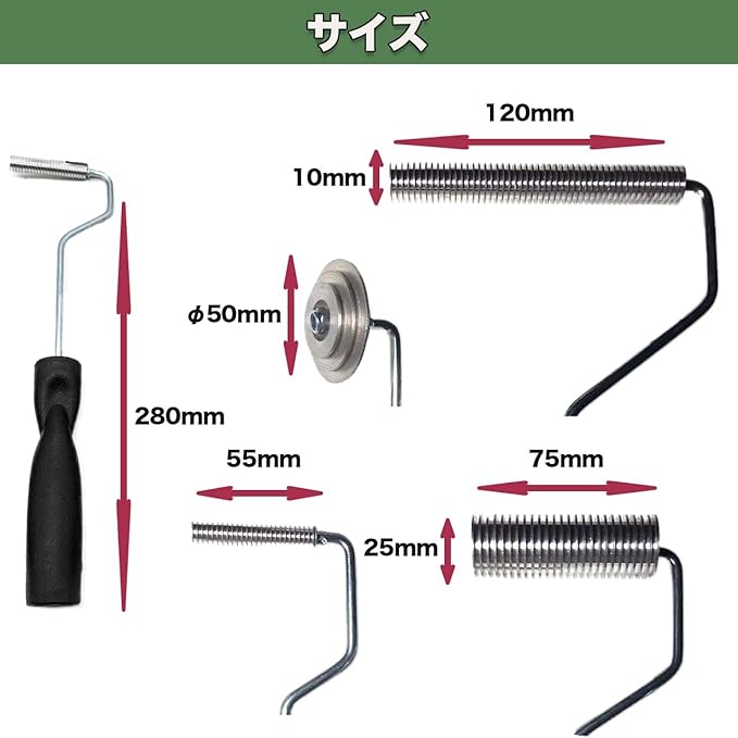 直径10mm 幅50mm ストレートグレインローラー ・直径25mm 幅75mm ストレートグレインローラー ・直径50mm 幅13mm コーナーローラー ・直径15-25mm 幅50mm アークローラー セット数 4本セット(寸法がおおよそのサイズになります)