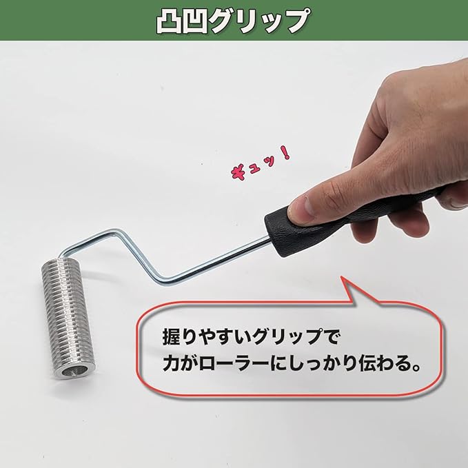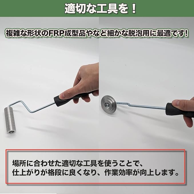 複雑な形状のFRP成型品やなど細かな脱泡用に最適です。凹凸のある握りやすいグリップで、力がローラーにしっかり伝わります。
