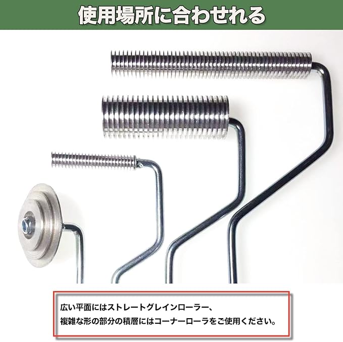 広い平面にはストレートグレインローラー(素材アルミ製)、複雑な形の部分の積層にはアークローラーとコーナーローラをご使用ください。