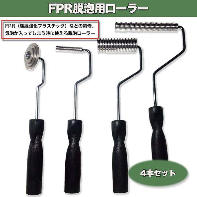 FRP脱泡用ローラー4点セット。FRP(繊維強化プラスチック)などの補修、気泡などが入ってしまうときに使える脱泡ローラーとなります。