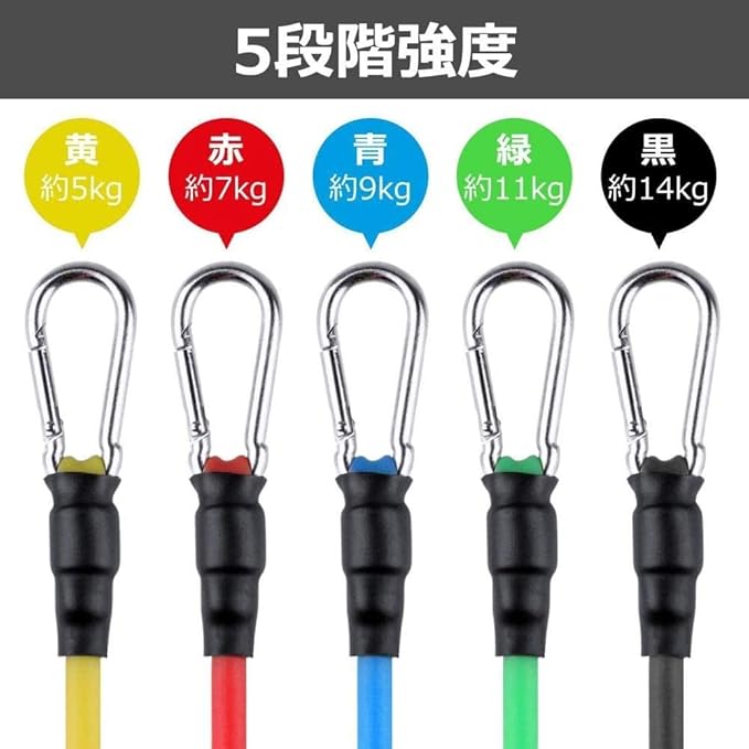 【複数の選択肢】5つの抵抗バンドはそれぞれ120cmで、各エクササイズバンドは色分けされており、すぐに認識できます。異なる色は異なる抵抗レベルを示します:黒(約 14kg)、緑(約 12kg)、青(約 9kg)、黄色(約 7kg)、赤(約5Kg)。初心者から上級者まで、強度によって複数の組み合わせにより、多彩なトレーニングをお楽しみ頂けます。