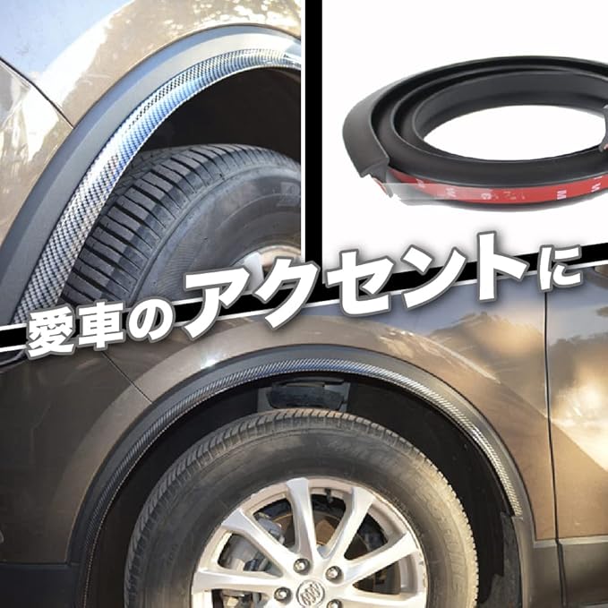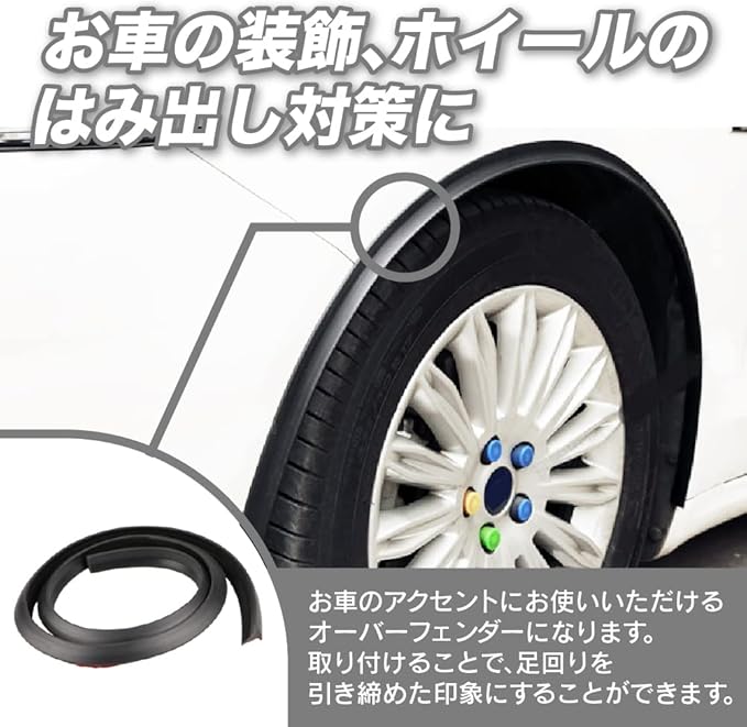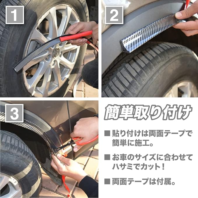 【取り付けも簡単】貼り付けは両面テープで簡単に施工でき、お車のサイズに合わせてカットしてお使い頂けます。タイヤのはみ出し対策にもお使い頂けますので、ぜひお車のドレスアップにお役立てください。