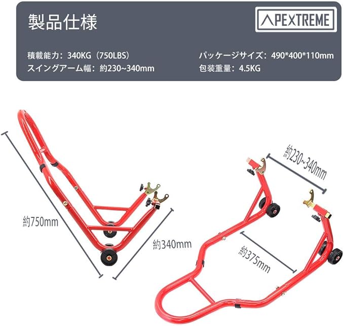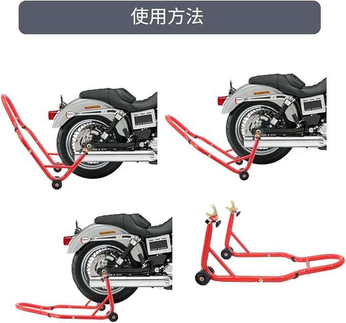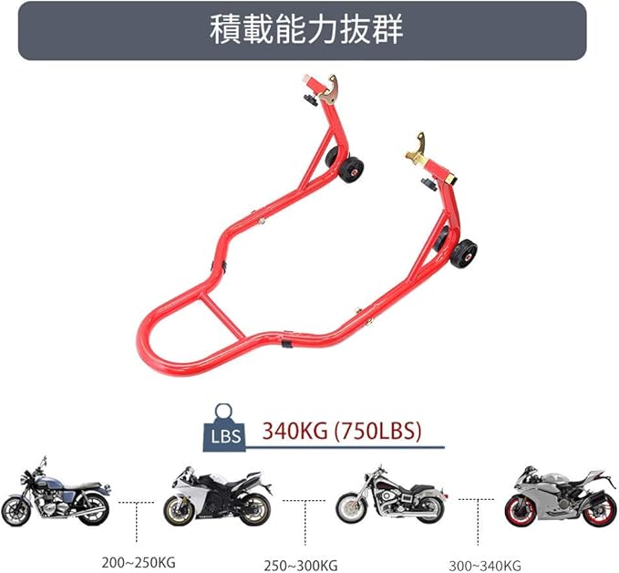 【積載能力】優れた積載能力(340kg/750LBS)を持っています。 バイクのメンテナンスから、日常修理などの整備まで幅広く使用可能な後輪用バイクスタンドです。