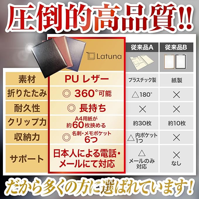 ✅【細部のこだわり&1年.】クリップは金属音がしないシックなものを採用。書類を約60枚挟んでも落ちることなく挟むことができる、耐久性のある商品となっております。また、当社製品は1年間のメーカー.が付いており、期間内であれば一定の条件下で無料にて返品・交換が可能となっております。