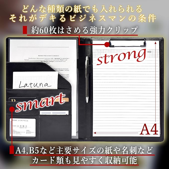 ✅【多サイズポケットで機能的】A4,B5,名刺,カードなど、様々な種類の大きさに対応できるポケットをご用意しました。透明なポケット付きのため、つい忘れがちな大事な取引先の方の名刺などを常に見えるようにできる仕組みとなっております。しっかり入れることで、A4の書類もはみ出ることなくご使用いただけます。