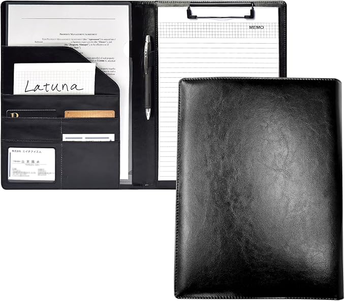 バインダー A4 クリップボード 【Latuna ラチュナ】 ファイル 2つ折り 革 クリップ 贈り物 PU 名刺入れ 多機能 プレゼント ペンホルダー ポケット付き (ブラック, PUレザー) | oioioichan