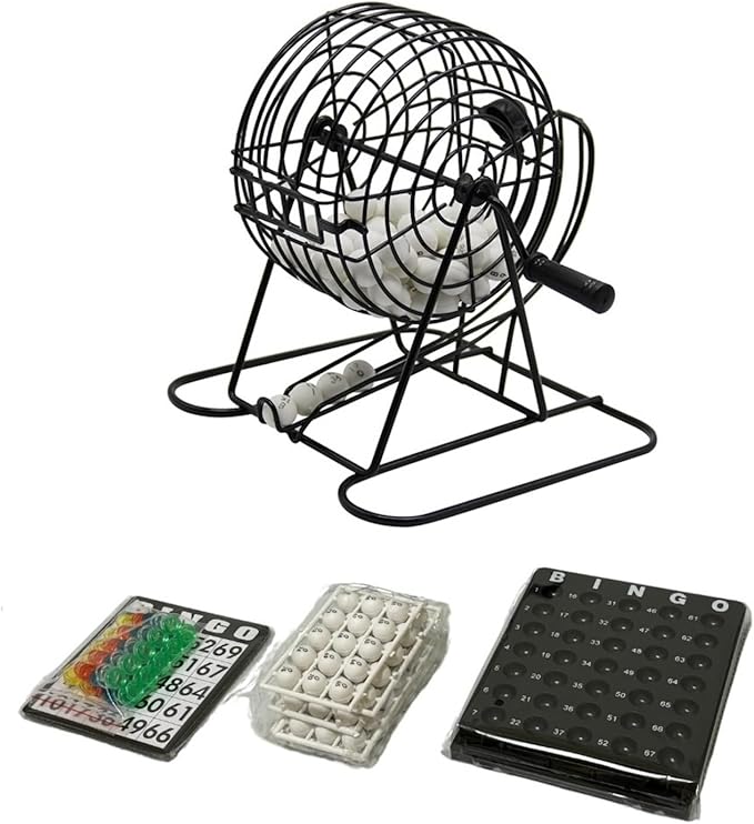 内容物:BINGOマシーン本体、ボール(1~75ナンバー入り)・ビンゴカード18枚(マーカーをおいていくタイプ)・ボールトレイ・マーカー(5色各30枚/計150枚)