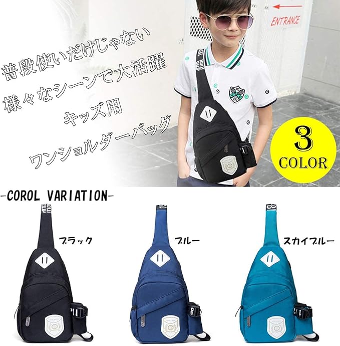 【男の子・女の子両方使える】 シンプルでオーソドックスなデザインは男の子・女の子どちらでもお使い頂けます。シックなブラック(黒)、落ち着いたブルー(青)、爽快なスカイブルー、の3色展開で様々なシーンにあわせる事ができるボディバッグです。