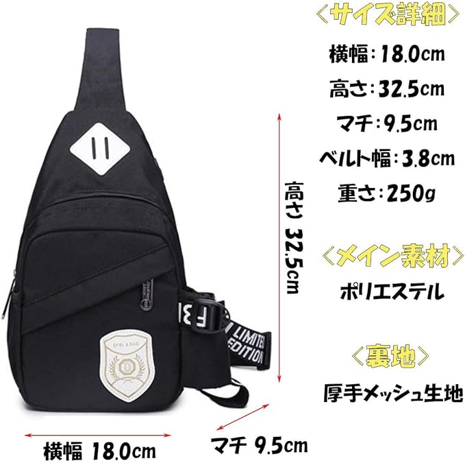 【サイズ】 縦 32.5cm 横 18.0cm 幅 9.5cm 【適用対象】 メンズ・レディース(男の子 女の子)どちらでもお使い頂ける男女兼用のボディーバッグとなっており、小学生にピッタリのサイズ感。
