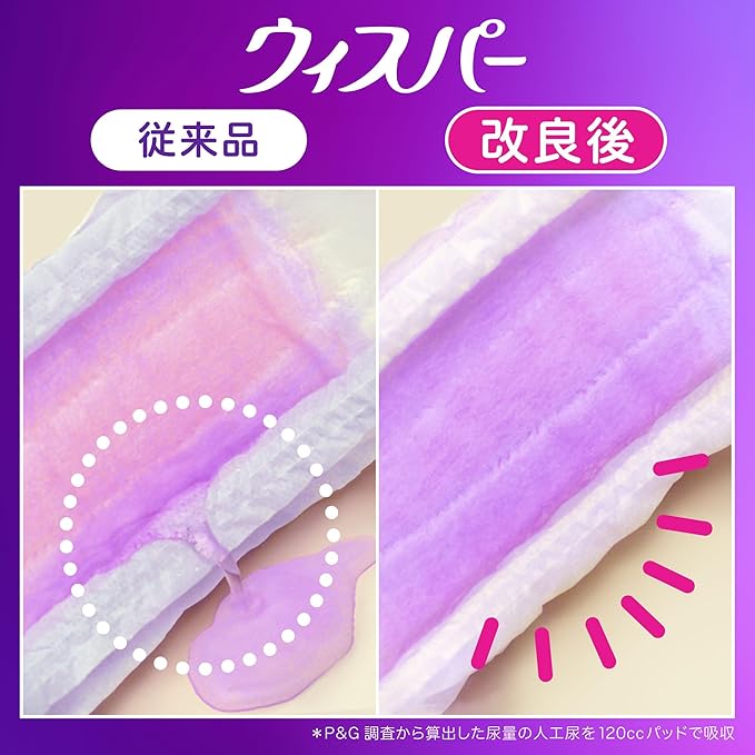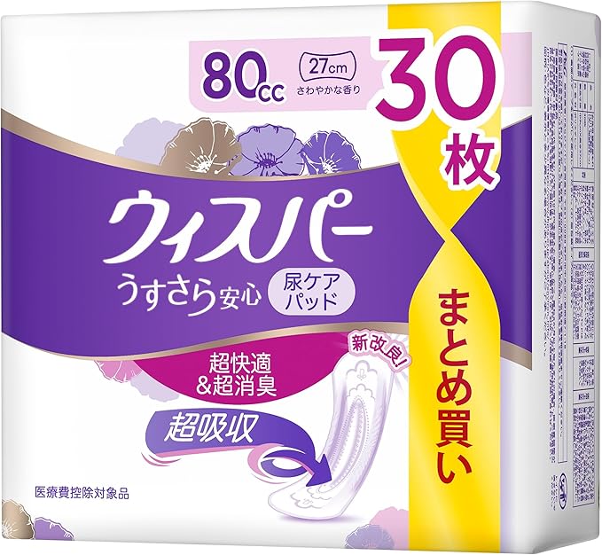 ウィスパーは女性用の吸水ナプキン(尿漏れパッド、尿とりパッド)です。(尿もれ、にょう漏れ、尿モレ、尿取り)