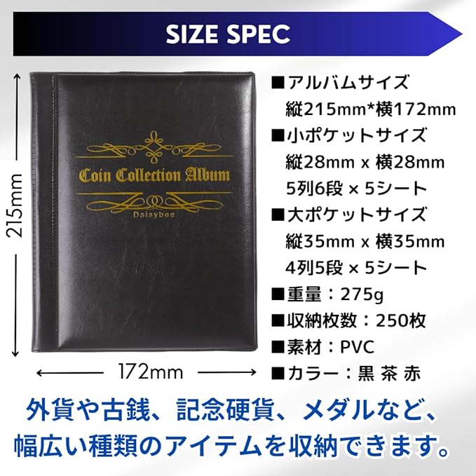 【商品仕樣】■コインアルバムサイズ:縦215mm*横172mm ■重量:275g ■収納枚数:250枚 ■素材:合成皮革 塩化ビニール
