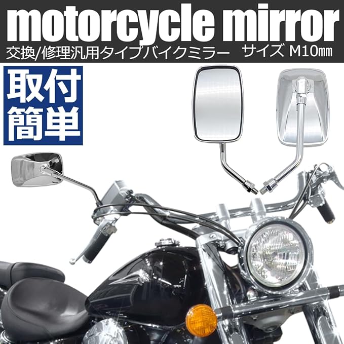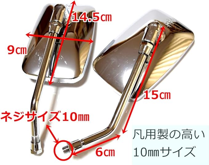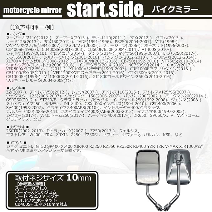 取付ネジサイズ M10 (10mm) 正ネジ 中型~のネイキッドバイクにフィットするメッキミラーです。 スクエアタイプの形状でビッグスクーターからミドルネイキッドにオススメ♪ 一般的な10mm正ネジの車種には幅広く取り付け可能!