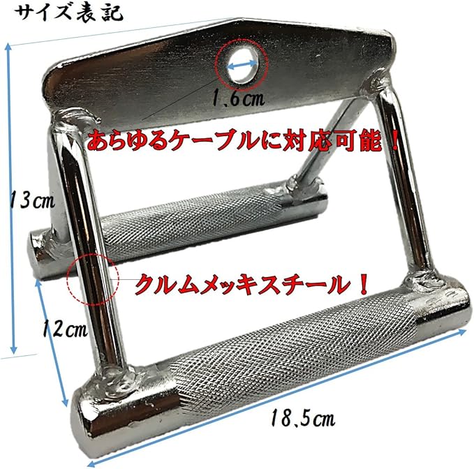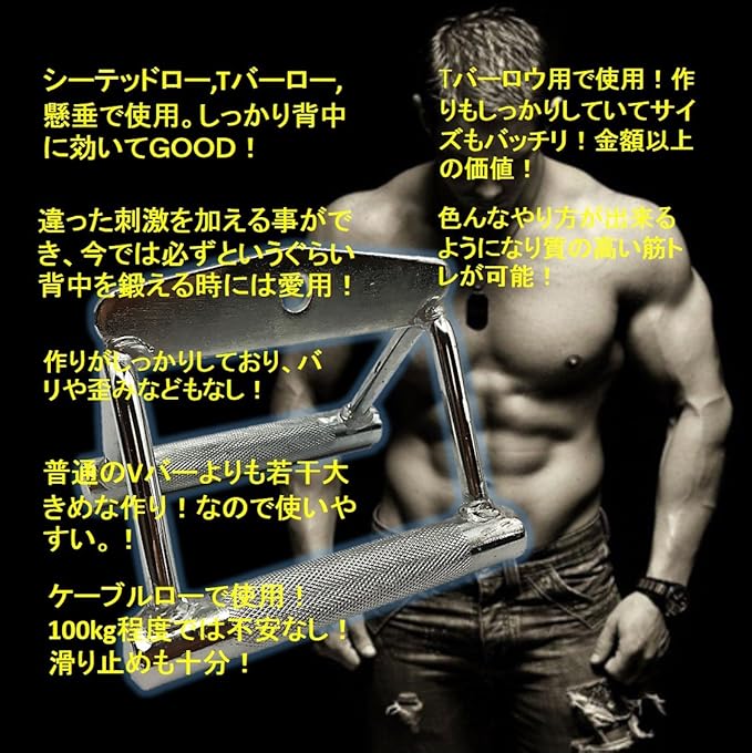 【使用感】シーテッドロー Tバーロー 懸垂で使用。しっかり背中に効いてGOOD!/違った刺激を加える事ができ、今では必ずというぐらい背中を鍛える時には愛用!/作りがしっかりしており、バリや歪みなどもなし!/普通のVバーよりも若干大きめな作り!なので使いやすい!ケーブルローで使用!/100kg程度では不安なし!滑り止めも十分!/Tバーロウ用で使用!作りもしっかりしていてサイズもバッチリ!金額以上の価値!/色んなやり方が出来るようになり質の高い筋トレが可能!