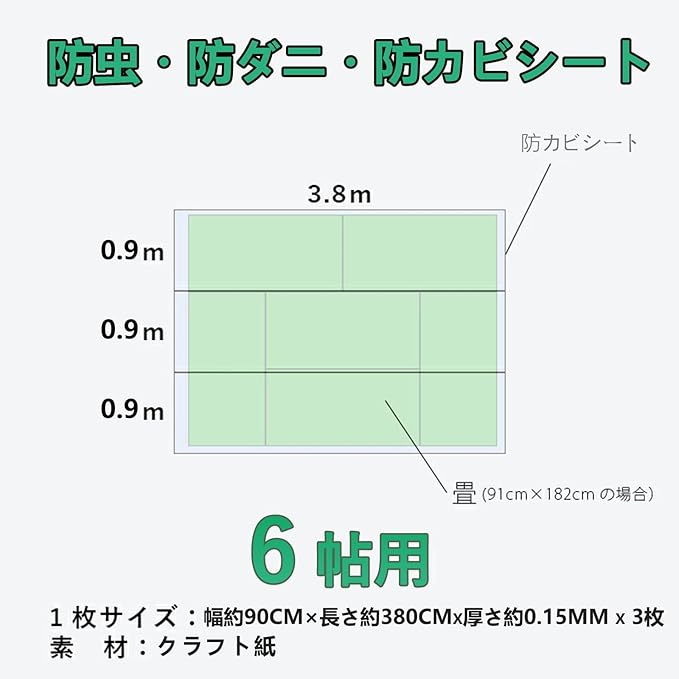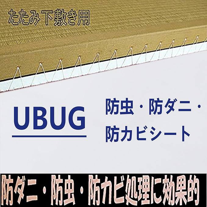 【サイズ】 6畳用(約90 X 380cm X 3枚)ブランド:UBUG ※ 防虫・防ダニ・防カビシートと他のシートをあわせて使う場合、防虫・防ダニ・防カビシートを畳の一番近くに敷いてください。上から順番に:1.畳 2.防虫シート 3.竹炭シート 4.防湿シート