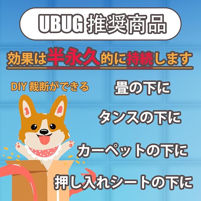 【効果が半永久的なの 】ホウ酸塩は揮発性の物質ではないため、効果は半永久的に持続します。ホウ酸塩は、防カビ・作用・難燃効果があります。水溶性が高い物質のため、長時間にわたり水分などに浸かった状態が続くと、ホウ酸塩がシートから溶け出して、効果が減少します。※UBUGの防虫・防ダニ・防カビシートと竹炭シートや防湿シートを合わせて使うとより効果を発揮します。
