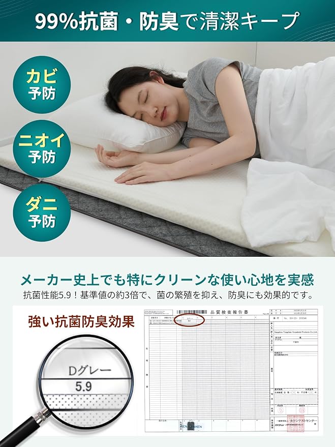 【抗菌防臭防ダニ】抗菌防臭加工付きで、菌の繁殖を抑え、寝具をいつも清潔に保つことができます。夏のジメジメのニオイや寝汗による体臭、加齢臭などをお使いの寝具から吸収して、イヤなニオイを減少してくれます。