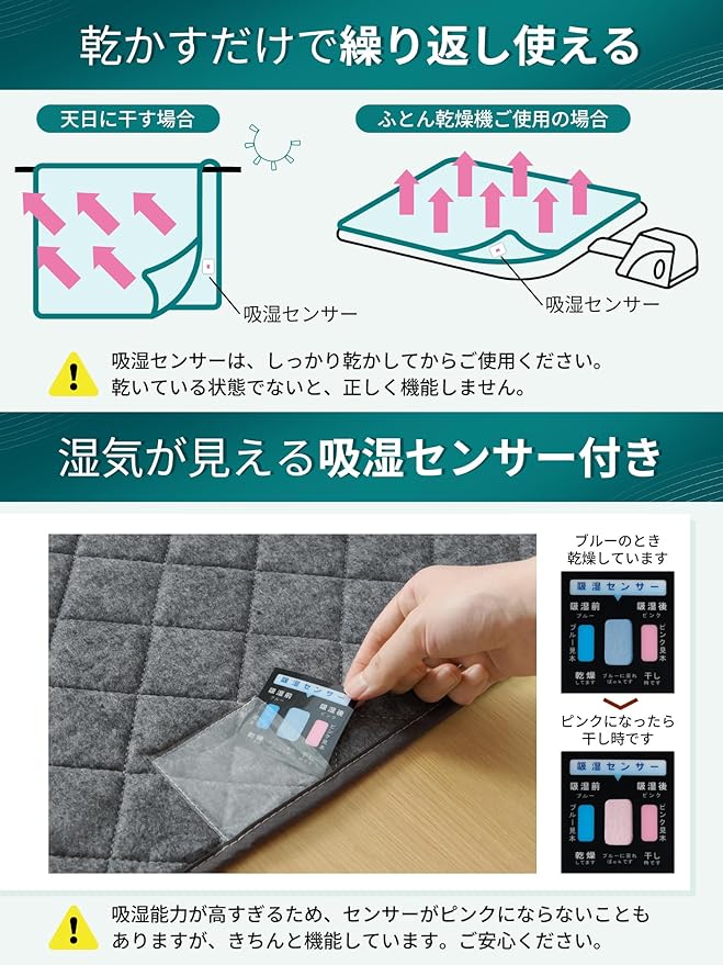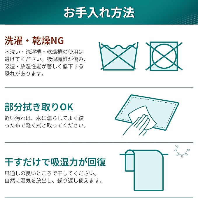 【丸洗いは禁止】特殊な吸湿繊維を使用したシートなので、洗濯機での丸洗いは禁止です。汚れましたら、濡れた布で軽く拭いて、又は汚れが目立つ箇所を部分的に手で洗ってください。