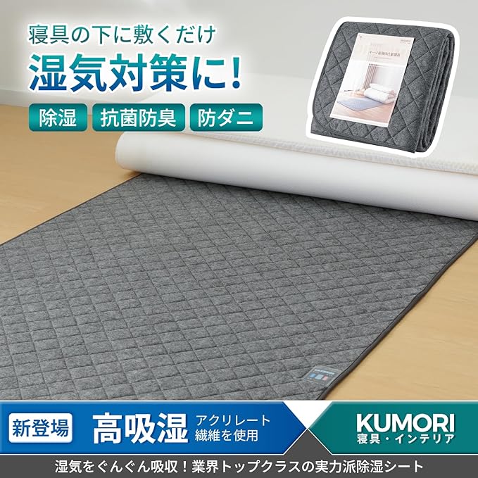 クモリ(Kumori) 除湿シート シングル 「高吸湿力」 防カビ 防ダニ 消臭 ダニ対策 吸湿センサー付き 湿気 結露対策 梅雨 吸湿シート 寝具用除湿マット 寝具用 除湿マット 湿気取り 繰り返し使える グレー 90X190cm | oioioichan
