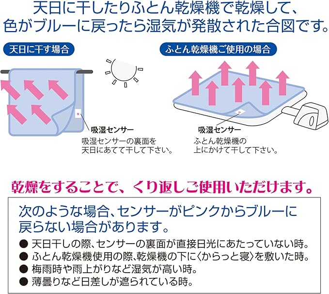 お手入れ簡単! 色が変わってお知らせする吸湿センサー付きなので、センサーの色が変わったら天日に干したり布団乾燥機で乾燥してください。乾燥することで繰り返し使えます。