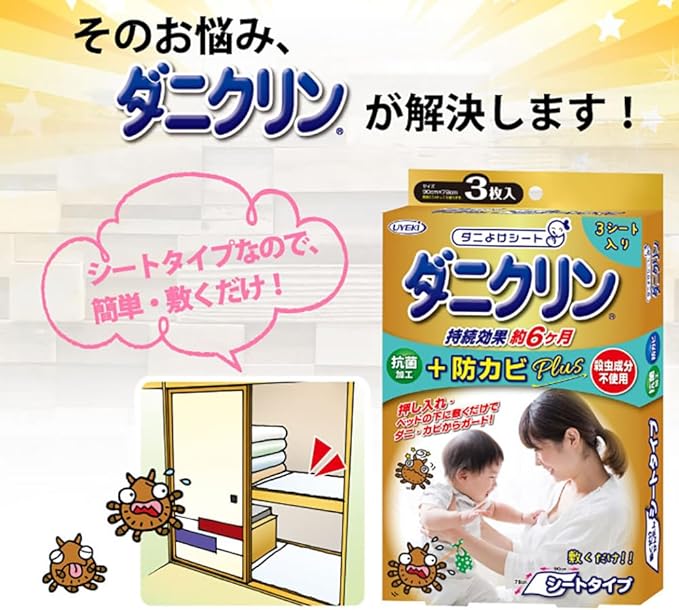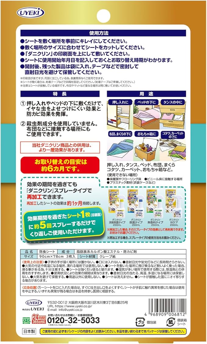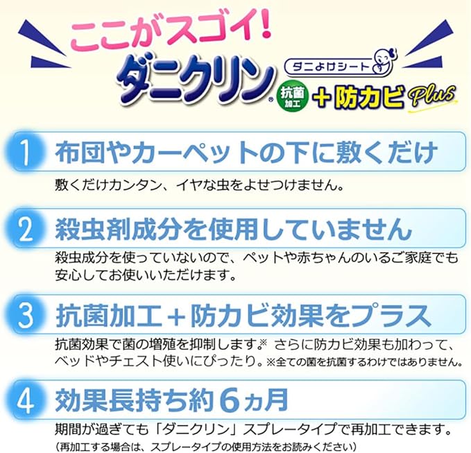 お取替えの目安は約6ケ月です。効果の期間を過ぎても「ダニクリン」スプレータイプで再加工できます。再加工したシートの効果は約1ケ月持続します。