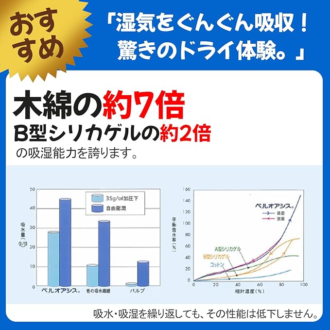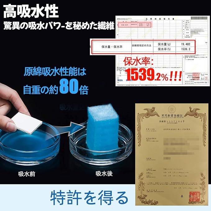 【7倍の吸湿力】日本専門的な検査機関BOKENの品質報告書によると、MeillyHoomi除湿シートの保水率は1539.2%になっており、吸湿性能は棉の7倍で、約普通B型シリカゲル粒子の2倍です