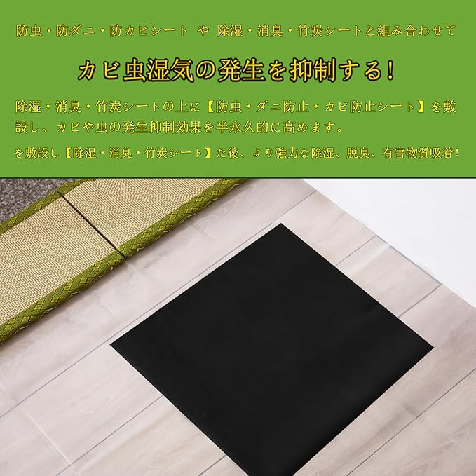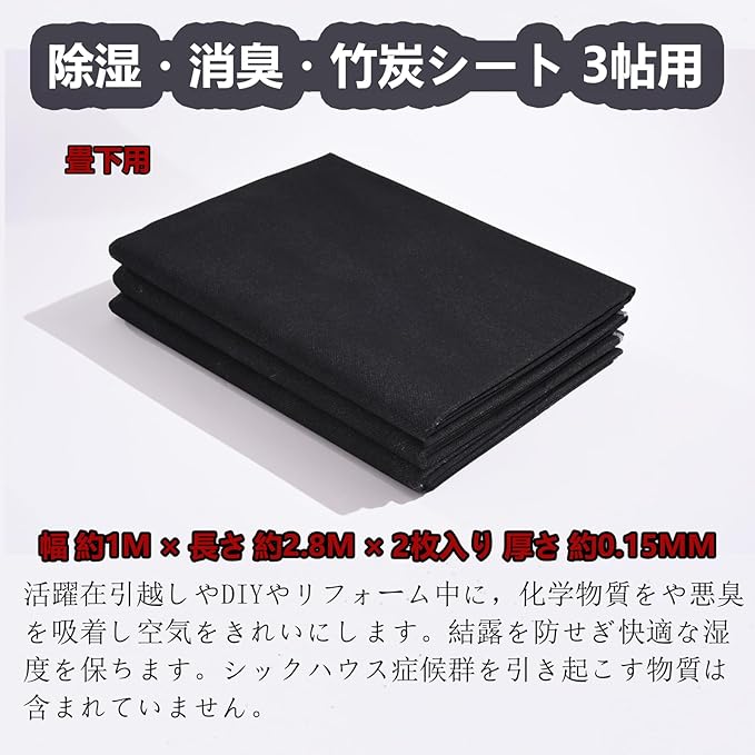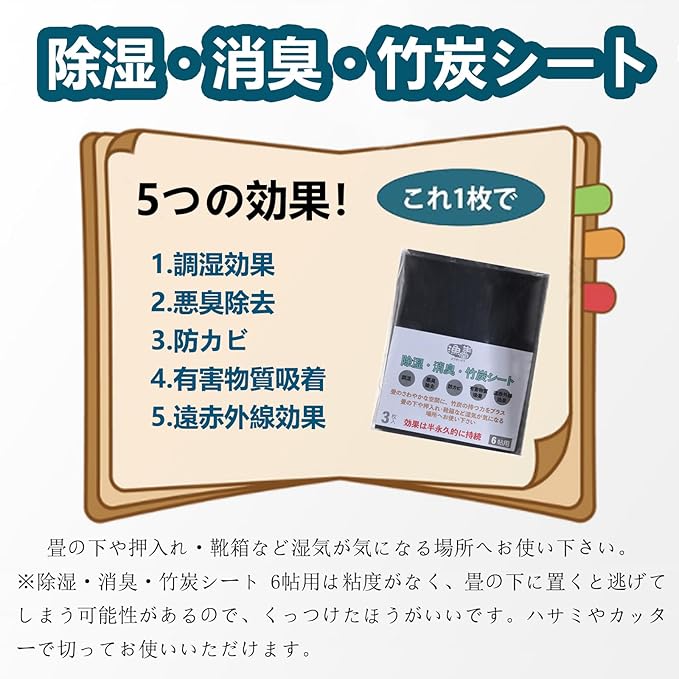 【適用場所】畳の下や押入れ・靴箱など湿気が気になる場所へお使い下さい。※除湿・消臭・竹炭シート 6帖用は粘度がなく、畳の下に置くと逃げてしまう可能性があるので、くっつけたほうがいいです。ハサミやカッターで切ってお使いいただけます。