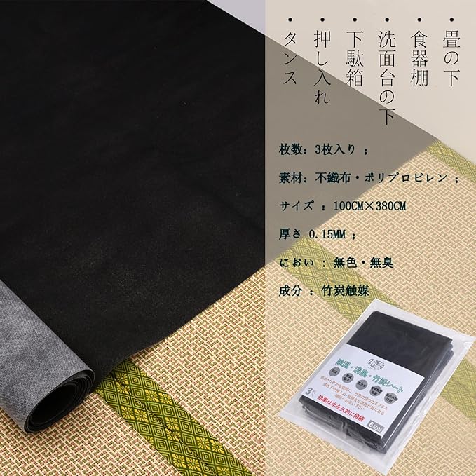 【特徴】枚数:2枚入り ;素材:不織布・ポリプロピレン ;サイズ :100cm 280cm 厚さ 0.15mm ;におい:無色・無臭 成分 :竹炭触媒 ※ 2枚入っててそれを敷き詰めたら3畳でした。