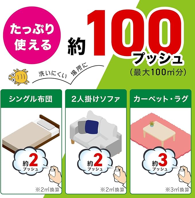 事前準備や掃除は不要です!ふとん、カーペット、ソファなどに直接プッシュしてダニ対策。
