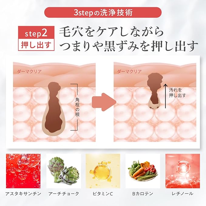 ✨【厳選したこだわり成分配合!毛穴の黒ずみ汚れがすっきり!】だけでなく、ビタミンA(レチノール)、ビタミンC誘導体、ビタミンE(トコフェロール)が、肌のキメを整え、肌にハリを与えます!