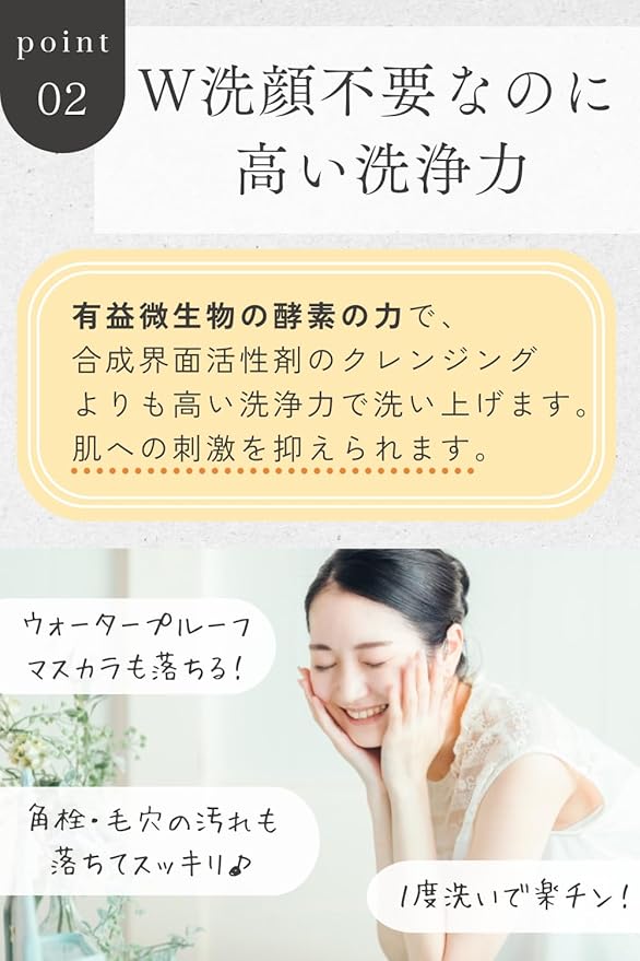 ✅【W洗顔不要】有益微生物の酵素が、通常の合成界面活性剤クレンジングよりも高い洗浄力で洗い上げます。洗顔と化粧落としを一度にでき、お肌がしっとりします。