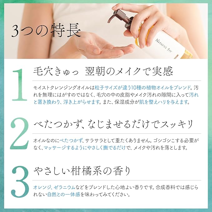 粒子サイズが違う10種の植物オイルをブレンドしています。そうすることで汚れを無理にはがすのではなく、毛穴の中の皮脂やメイク汚れの隙間に効率よく入ってメイク汚れと置き換わり、自然に浮き上がらせることが出来るのです。