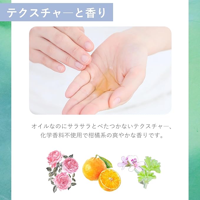 オイルなのにべたつかず、お肌になめらかになじみます。オレンジ、ゼラニウムなどをブレンドした心地よい香りです。