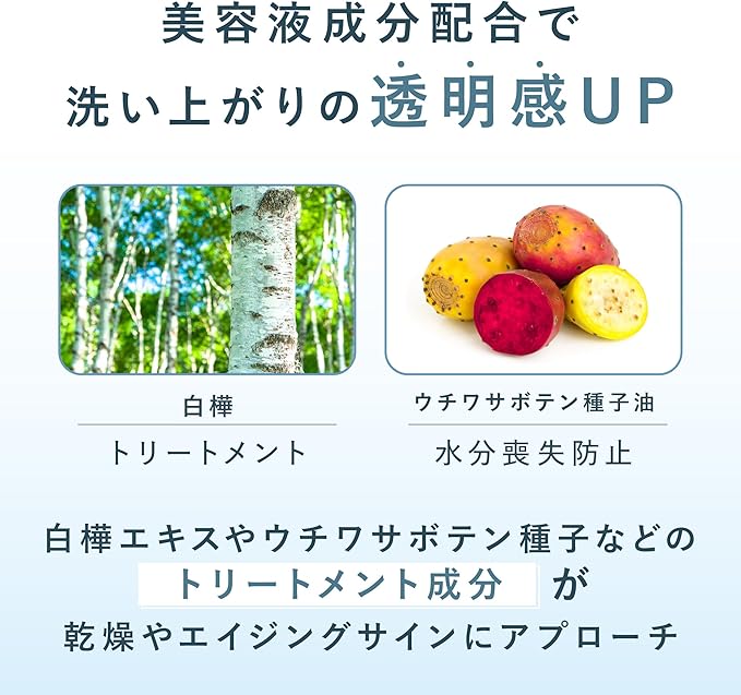 ≪ POINT3 ≫ 機能で洗いあがりもちもち、透明感UP。:白樺の樹液とウチワサボテン種子油から抽出したHydro-Gain※3によってバリア機能を高め、肌の保水力を向上。洗いあがりはしっとりとした吸いつくような肌に。 ※3 グリセリン、水、カノラ油、水添レシチン、野菜油(オプンチアフィクスインジカ種子油)、ヨーロッパシラカバ樹皮エキス、クエン酸