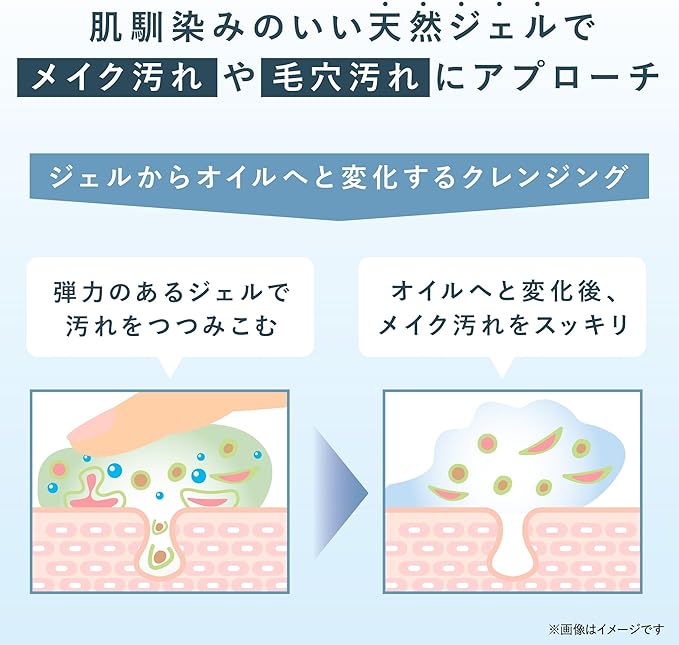 ≪ POINT1 ≫ ジェルの使いやすさとオイルのクレンジング力を両立。:弾力のあるジェルがメイク汚れなど肌に不要なものだけをしっかり包み込み、オイルへと変化。毛穴の奥や角層の隅々まで入り込みメイク汚れをスッキリ落とします。【STEP01 ジェル】⇒【STEP02 オイル】⇒【STEP03 ミルク】