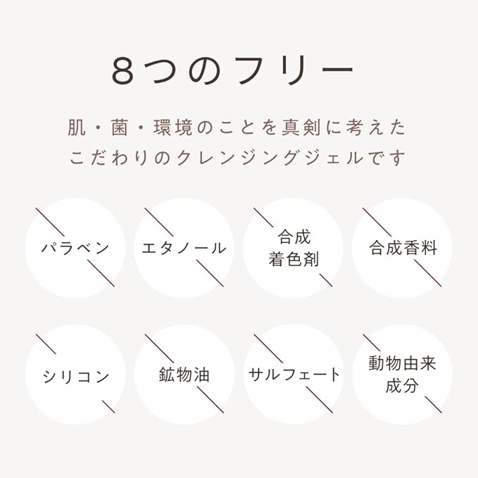【8つのフリー】パラベン・エタノール・合成香料・合成着色剤・鉱物油・動物由来成分・シリコン・サルフェート