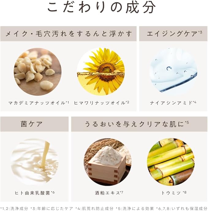 【使用方法】マスカット大程度を乾いた手のひらにとり、 軽くするように優しく全体になじませます。 メイクや汚れにオイルが馴染んで、感触が軽くなってきたら、丁寧に水またはぬるま水ですすいでください。菌由来の洗浄成分* が細かい粒子に変わり、サッと馴染んで流れるので、乳化のステップは不要です。クレンジングだけでなく、洗顔としてもご使用いただけます。