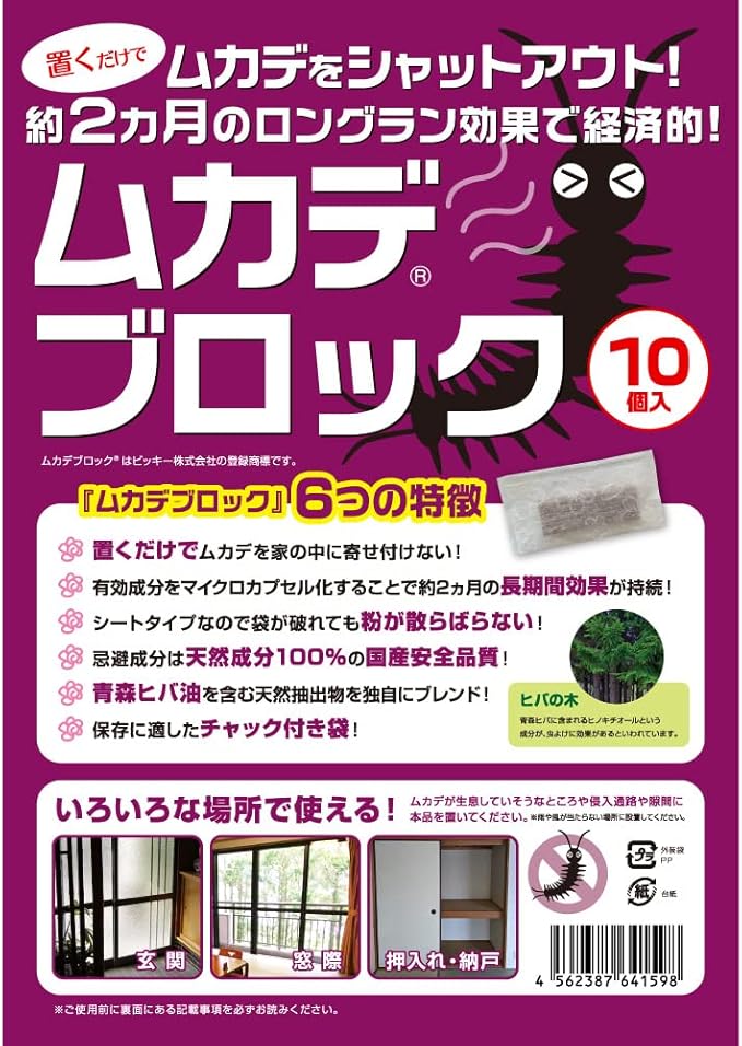 パッケージリニューアルしました。ムカデブロック【サイズ】約55 105㎜【重量】約1g(1個あたり)【セット内容】10個【生産国】日本【主成分】青森ヒバ油、木酢液、桐オイル【有効期間】約2か月【消費期限】開封後1年(チャック付き袋等で密閉した場合)未開封3年