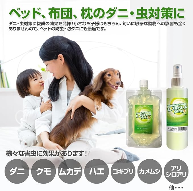 特に防虫効果が非常に高く、お部屋やベッドのダニ防虫、蚊よけ、農業や家庭菜園のカメムシ対策にも最適です。