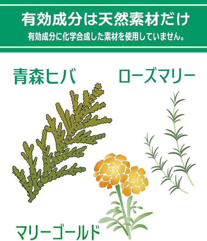 【特徴①】有効成分を天然素材(青森ヒバ・マリーゴールド・ローズマリーなどの天然ハーブ抽出成分)だけで製造しています。有効成分に対し化学合成した素材を一切使用していまん。※ヒノキチオールにアレルギーのある方は居室や寝室内でのご使用をお控えください。