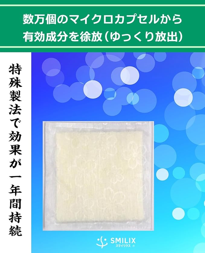 【特徴③】有効期間は設置後約1年間。シート内のマイクロカプセルから有効成分を徐放(ゆっくり放出)する特殊製法で、防虫・防カビの効果が約一年間持続します。※密閉しない空間や広い空間では、効果の持続時間が短くなる場合があります。