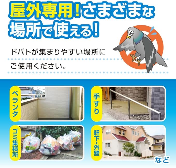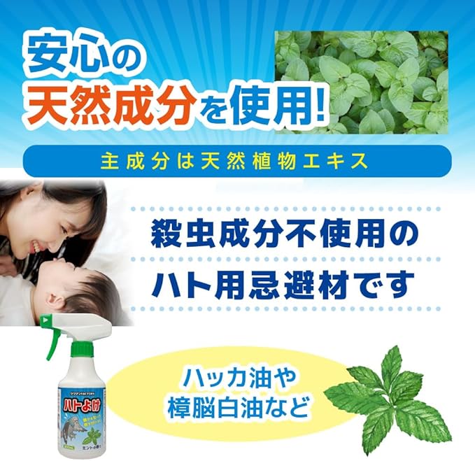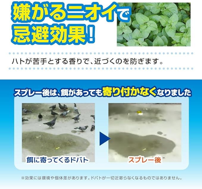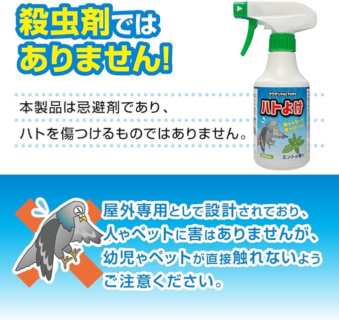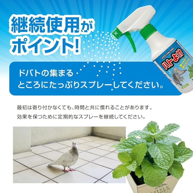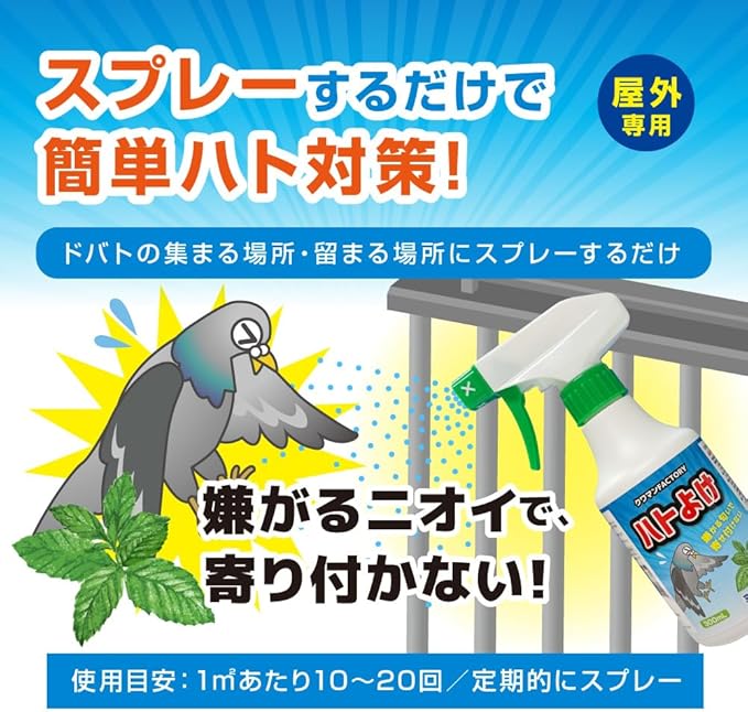 ①スプレーするだけで簡単ハト対策! ②屋外専用!さまざまな場所で使える! ③安心の天然成分を使用! ④嫌がるニオイで忌避効果! ⑤継続使用がポイント! ⑥殺虫剤ではありません!