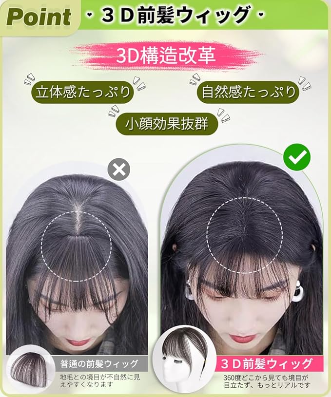 【3D構造前髪ウィッグ】シースルーバング+サイドバング+後ろ髪❣こんな組み合わせで顔を絶妙に隠し、小顔効果抜群で女性に似合う髪型です。癒し効果もあるエアリーなスタイルで女の子らしさをアピール♪