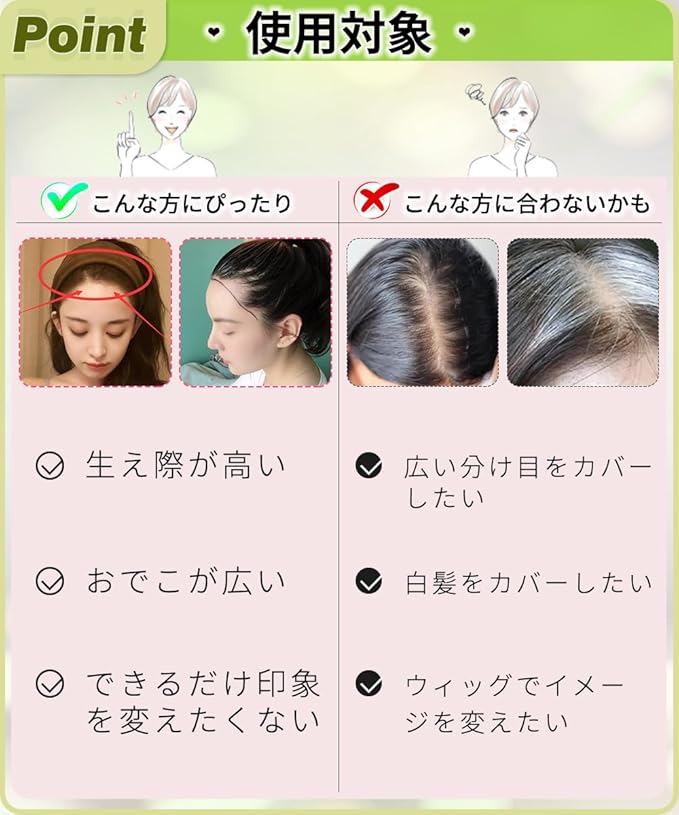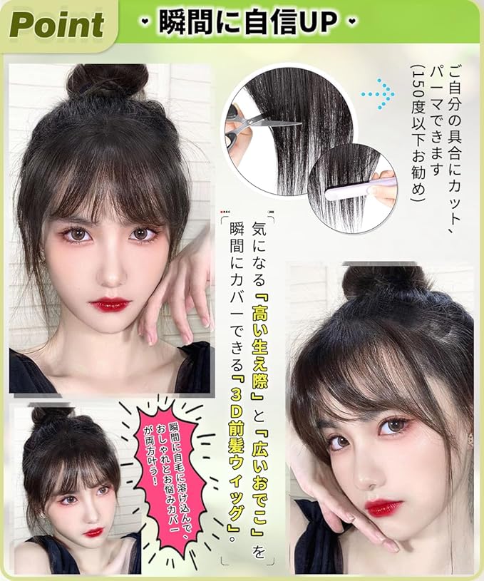 【お勧め対象】: 女の子力をアップしたい方❣ 前髪を作りたいけど勇気が出ない方❣ 特におでこが広い方と生え際が高い方❣ この前髪ウィッグを一つだけで、瞬間にこんな悩みを解決!