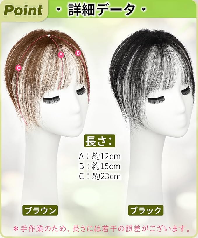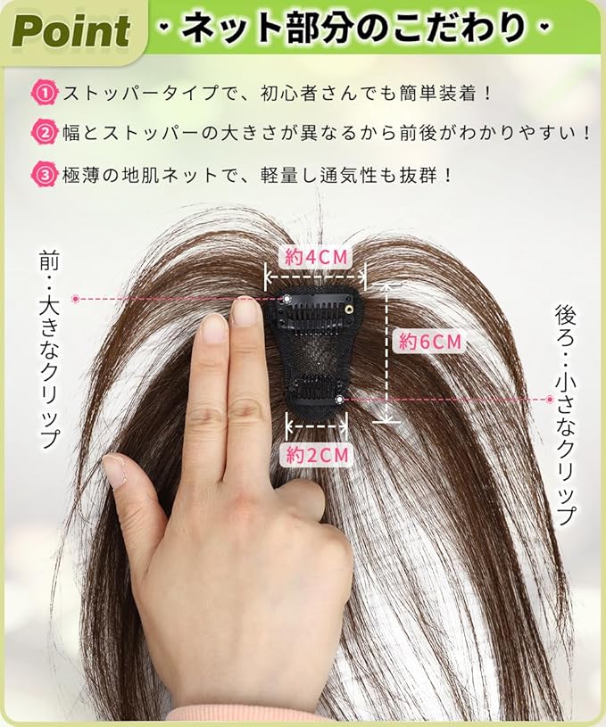 【商品規格】 ①サイズ:前髪約13cm、サイド約15cm、後髪約20-25cm ②カラー:ブラック、ブラウン。 ③重さ:約9g。 ④スタイル:モテ髪 ⑤素材:100%。総手植え仕様。一本ずつ手植えを施したハンドメイドタイプ。根元がふんわりと自然に立ち上がり、より自然な風合いになります