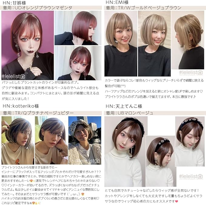 商品説明:大人気カラメルトップスボブが新カラバリとI型つむじになってリニューアル! 今期もトレンドの毛先をぷつっと切り揃えたボブのスタイルでキュートさもあれば大人っぽさもある幅広い年齢層の方に親しまれるスタイルです。 前髪はあえての少し短め、これもお洒落度をアップさせるポイント。着用の位置で簡単にオン眉アレンジもできるのでぜひ挑戦してみてほしいです。 カラーは豊富に15色をご用意、ベーシックなカラーはもちろん、自然なニュアンスカラーが楽しめるMIXカラーや、定番人気のグラデーション、進化系インナーカラーもございます。きっとお似合いのカラーが見つかるはず。 ボブが好きな方にはもちろん、ボブに挑戦してみたいけど踏み出せない方に一度かぶってもらいたい。そんなウィッグです。